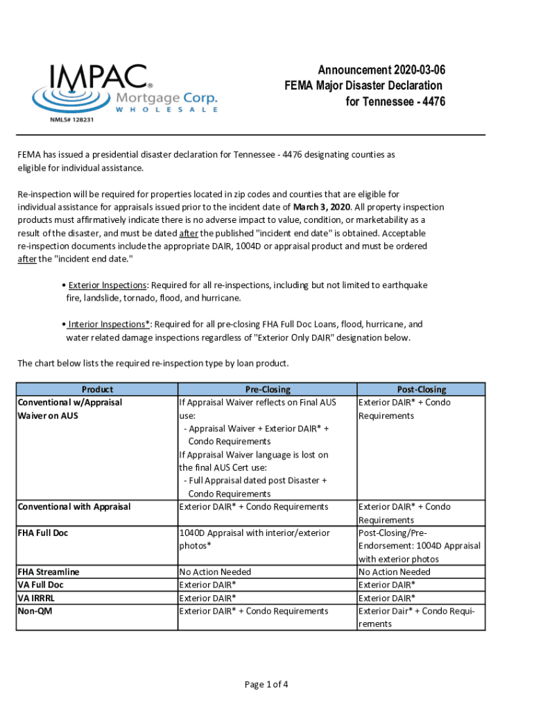 Announcement 20200306 FEMA Major Disaster Declaration for Tennessee 4476FEMA has issued a presidential disaster declaration for Tennessee 4476 designating counties as eligible for individual assistance.