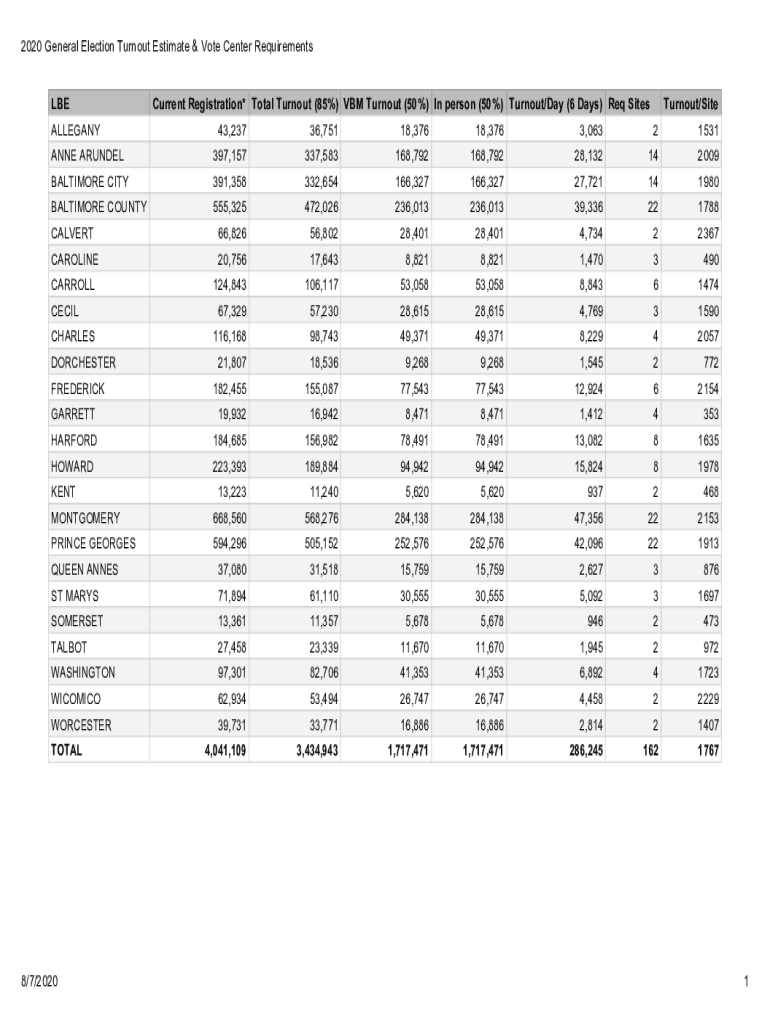 2020 General Election Turnout Estimate & Vote Center Requirements LBE ALLEGANYCurrent Registration* Total Turnout (85%) IBM Turnout (50%) In person (50%) Turnout/Day (6 Days) Req SitesTurnout/Site43,23736,75118,37618,3763,06321531ANNE