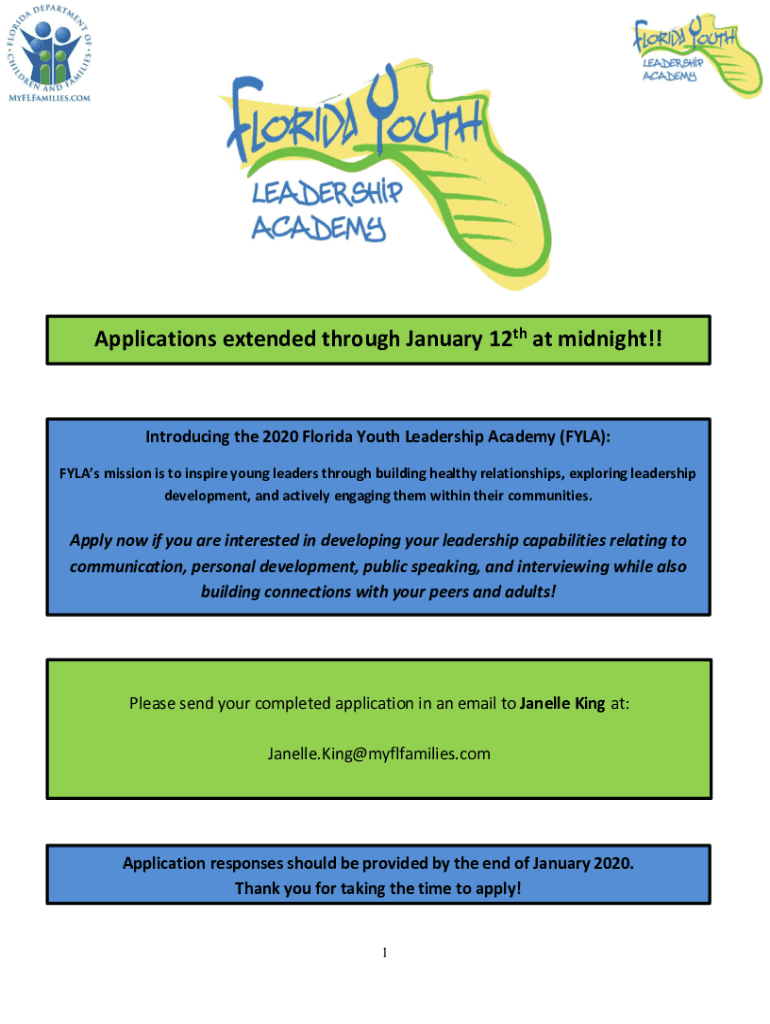 Applications extended through January 12th at midnight!! Introducing the 2020 Florida Youth Leadership Academy (FLA): Films mission is to inspire young leaders through building healthy relationships,