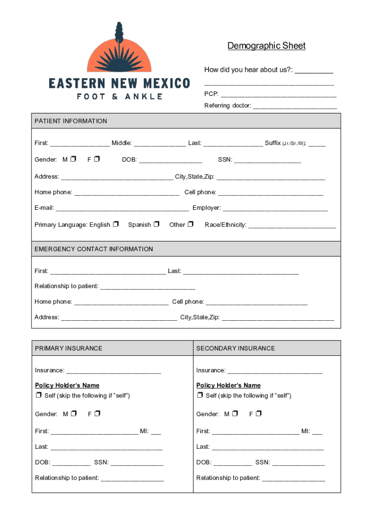 Demographic Sheet How did you hear about us?: PCP: Referring doctor: PATIENT INFORMATION First: Middle: Last: Suffix (Jr./Sr./III): Gender: M F DOB: SSN: Address: City, State, Zip: Home phone: Cell