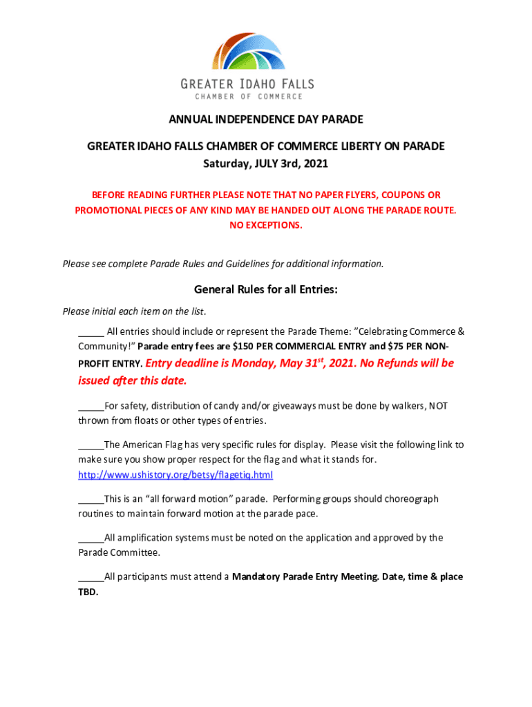 ANNUAL INDEPENDENCE DAY PARADE GREATER IDAHO FALLS CHAMBER OF COMMERCE LIBERTY ON PARADE Saturday, JULY 3rd, 2021 BEFORE READING FURTHER PLEASE NOTE THAT NO PAPER FLYERS, COUPONS OR PROMOTIONAL PIECES