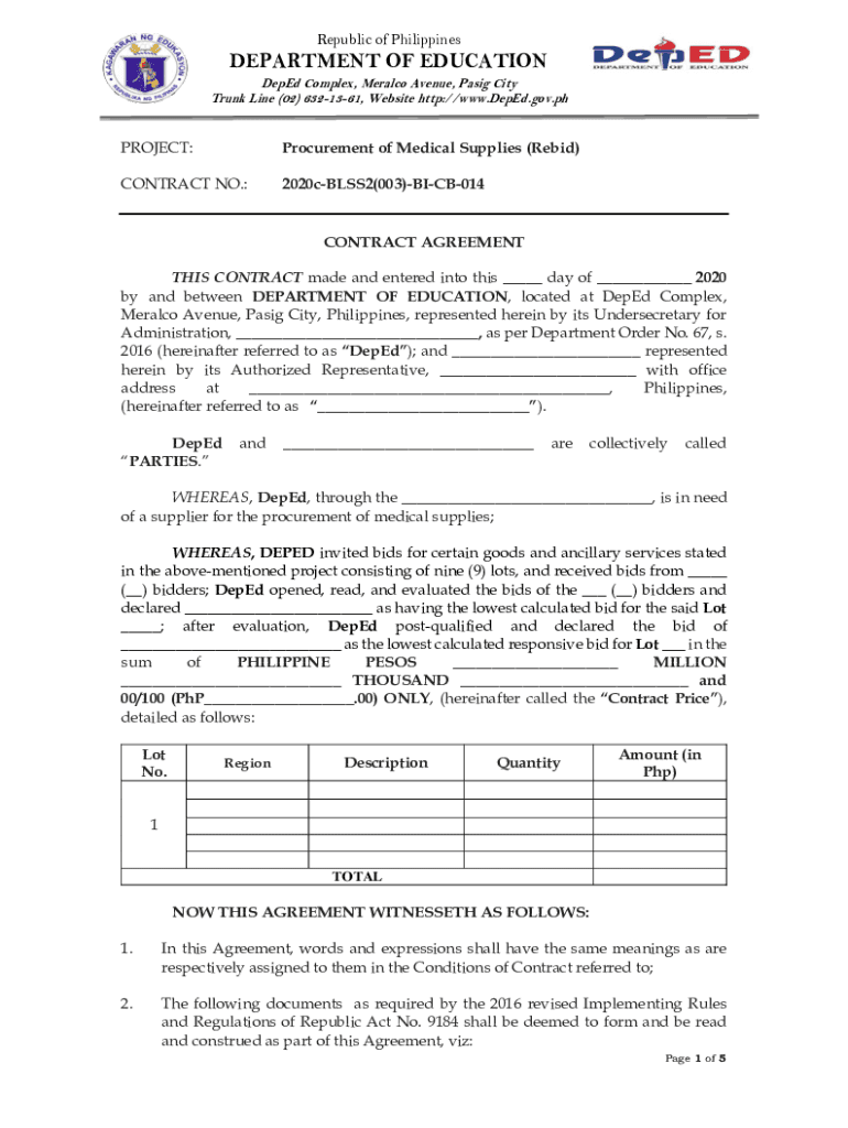 Republic of PhilippinesDEPARTMENT OF EDUCATION Depend on Complex, Geraldo Avenue, PSIG City Trunk Line (02) 6321361, Website http://www.DepEd.gov.phPROJECT:Procurement of Medical Supplies (Rebid)CONTRACT
