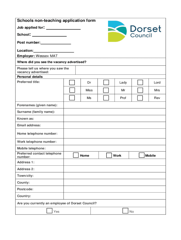 Schools nonteaching application form Job applied for: School: Post number: Location: Employer: Wessex MAT Where did you see the vacancy advertised? Please tell us where you saw the vacancy advertised:
