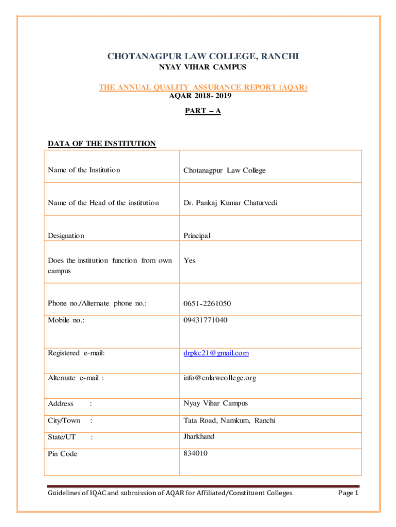 CHOTANAGPUR LAW COLLEGE, RANCHI NAY VICAR CAMPUS THE ANNUAL QUALITY ASSURANCE REPORT (AGAR) AGAR 2018 2019 PART DATA OF THE Institutional of the InstitutionChotanagpur Law Collegiate of the Head of
