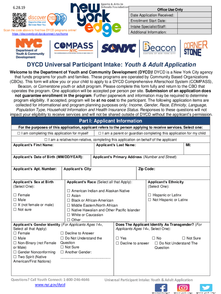 6.28.19Office Use Only Date Application Received: Enrollment Start Date: Intake Specialist/Staff:Scan the code above to find free DYED programs online! https://discoverdycd.dycdconnect.nyc/homeAdditional
