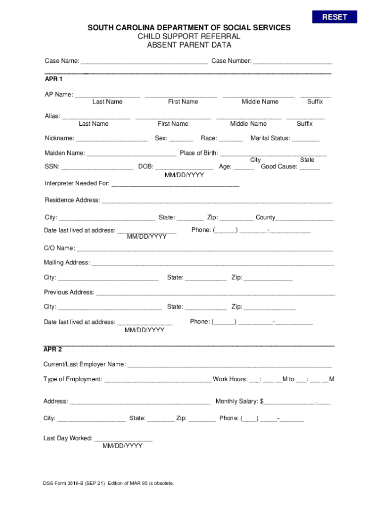 RESET SOUTH CAROLINA DEPARTMENT OF SOCIAL SERVICES CHILD SUPPORT REFERRAL ABSENT PARENT DATA Case Name: Case Number: APR 1 AP Name: Last Name First Name Middle Name Suffix Alias: Last Name First Name