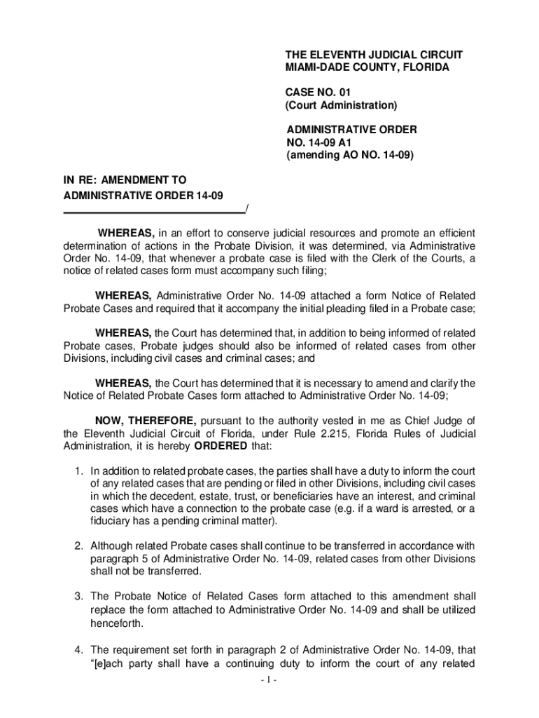 THE ELEVENTH JUDICIAL CIRCUIT MIA MIDADE COUNTY, FLORIDA CASE NO. 01 (Court Administration) ADMINISTRATIVE ORDER NO. 1409 A1 (amending AO NO. 1409) IN RE: AMENDMENT TO ADMINISTRATIVE ORDER 1409 /