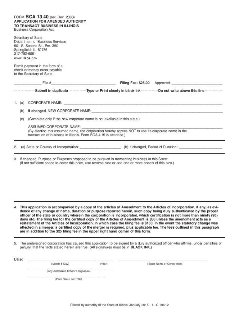 Reform BCA 13.40 (rev. Dec. 2003) APPLICATION FOR AMENDED AUTHORITY TO TRANSACT BUSINESS IN ILLINOIS Business Corporation Act Secretary of State Department of Business Services 501 S. Second St.,