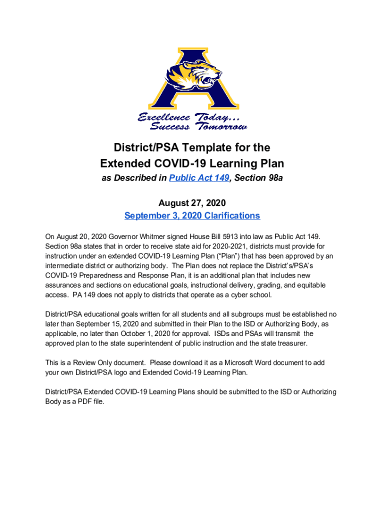 District/PSA Template for the Extended COVID-19 Learning Plan as Described in Public Act 149, Section 98a August 27, 2020, September 3, 2020, Clarifications On August 20, 2020, Governor Whitmer signed