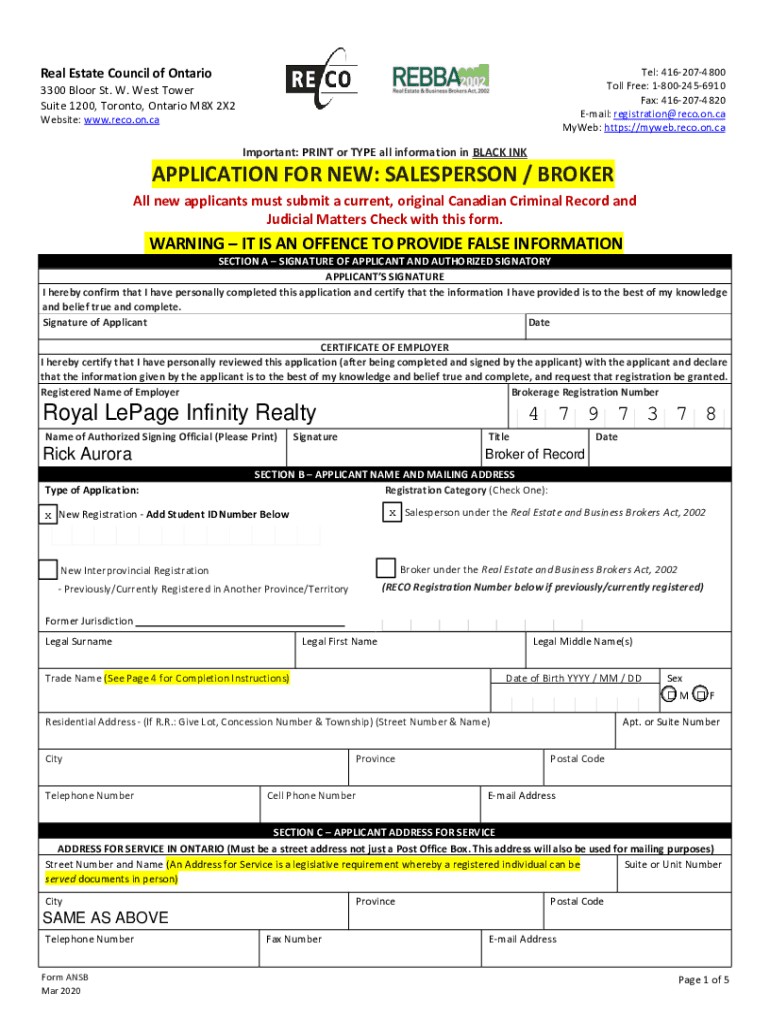Tel: 4162074800 Toll Free: 18002456910 Fax: 4162074820 Email: registration@reco.on.ca My Web: https://myweb.reco.on.caReal Estate Council of Ontario 3300 Bloor St. W. West Tower Suite 1200, Toronto,