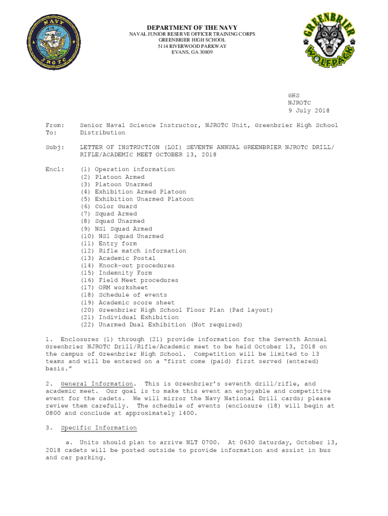 DEPARTMENT OF THE NAVY NAVAL JUNIOR RESERVE OFFICER TRAINING CORPS GREENBRIER HIGH SCHOOL 5114 LIVERPOOL PARKWAY EVANS, GA 30809GHS NJ ROTC 9 July 2018 From: To:Senior Naval Science Instructor, NJ