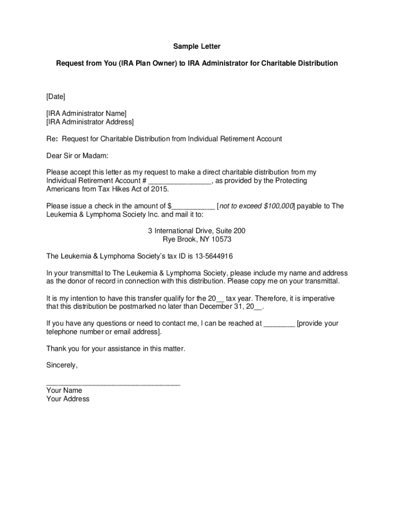 Sample Letter Request from You (IRA Plan Owner) to IRA Administrator for Charitable Distribution Date IRA Administrator Name IRA Administrator Address Re: Request for Charitable Distribution from