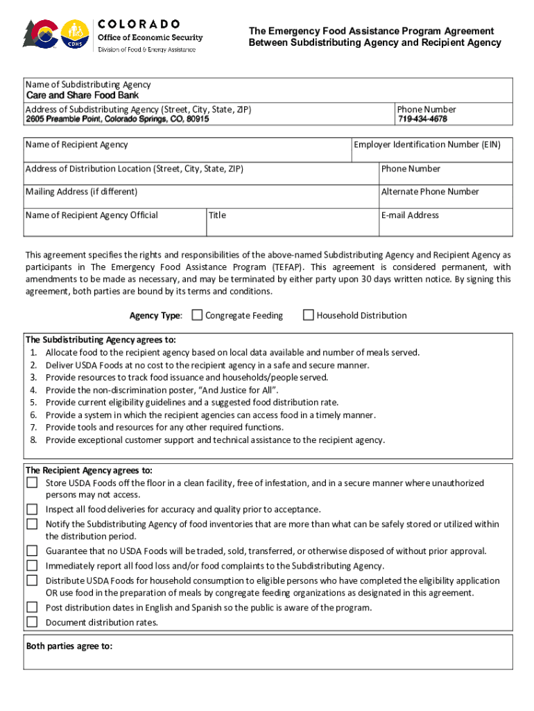 The Emergency Food Assistance Program Agreement Between Subdistributing Agency and Recipient AgencyName of Subdistributing Agency Care and Share Food Bank Address of Subdistributing Agency (Street,