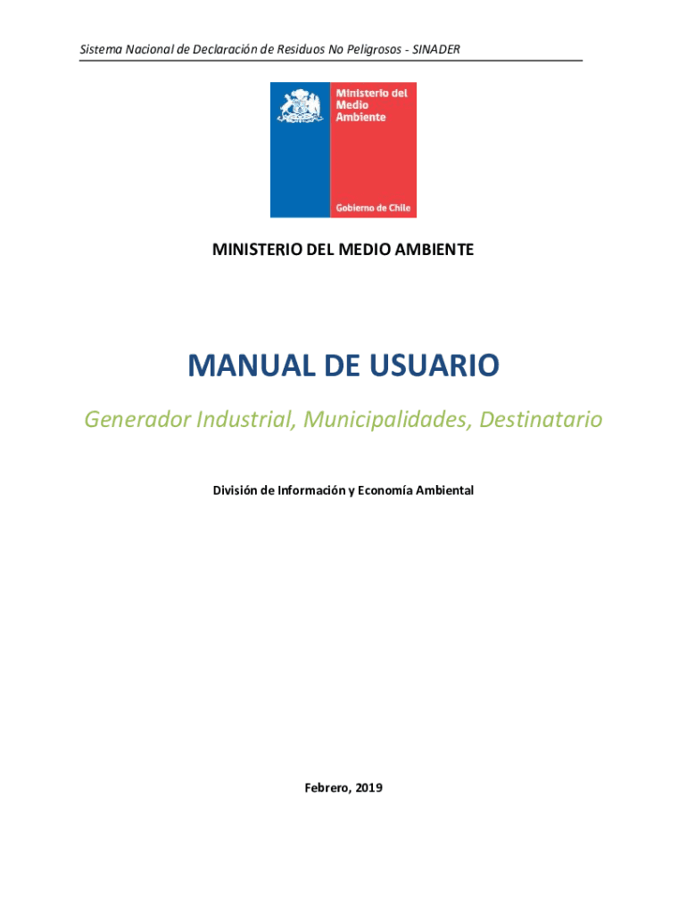 System Nacional de Declaracin de Residuos No Peligrosos SINADERMINISTERIO DEL MEDIA AMBIENTEMANUAL DE USUALLY Generator Industrial, Municipalities, Destination Division de Informacin y Economy AmbientalFebrero,