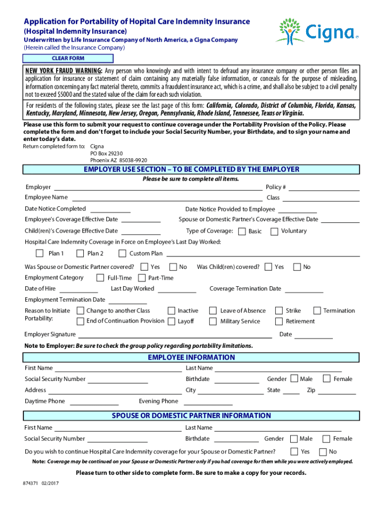 Get the free Cigna Portability of Hospital Care Indemnity Insurance. 874371 Interactive PDF
