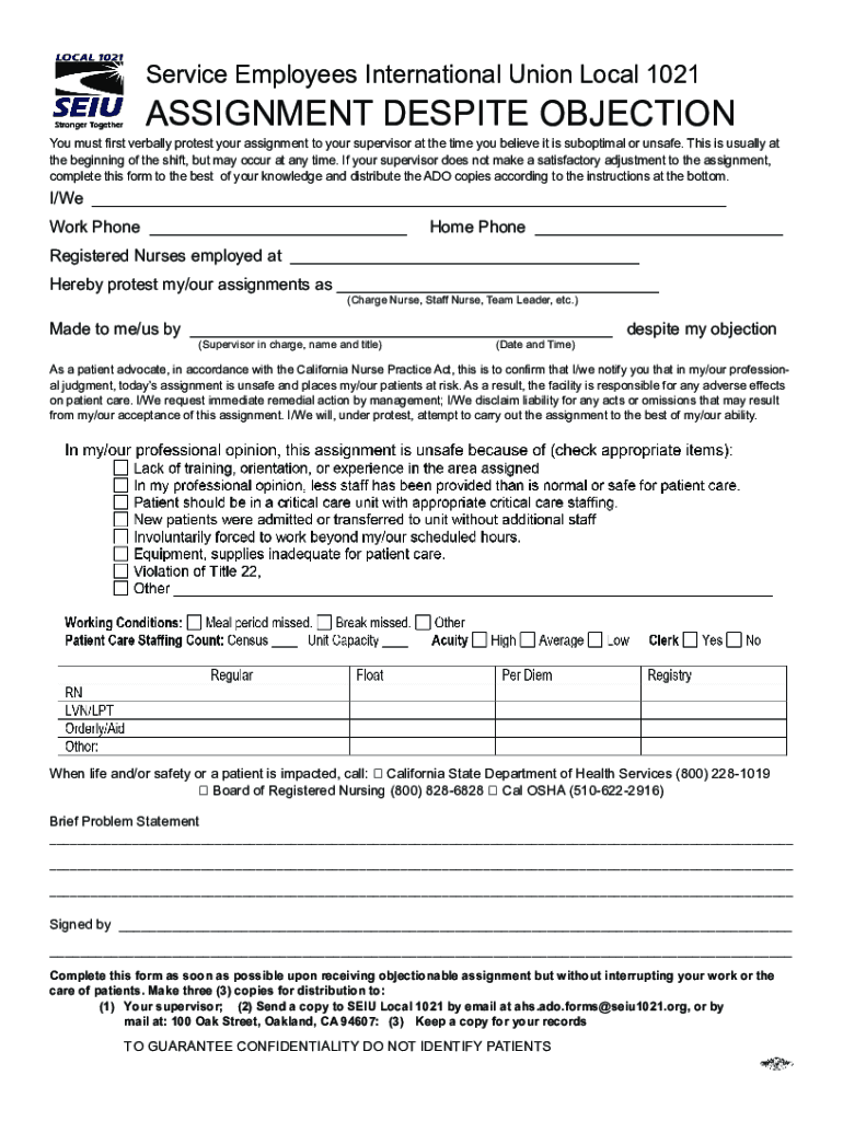 Service Employees International Union Local 1021ASSIGNMENT DESPITE Objection must first verbally protest your assignment to your supervisor at the time you believe it is suboptimal or unsafe. This