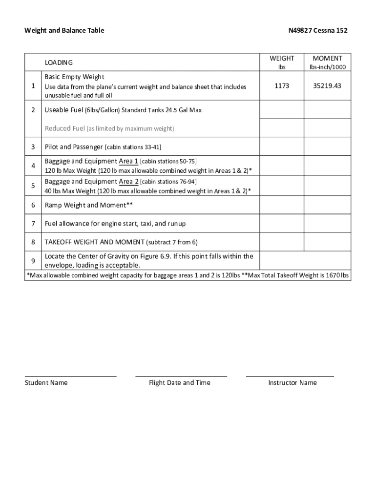 Get the free Weight and Balance Table N49827 Cessna 152 - angelaviation.com