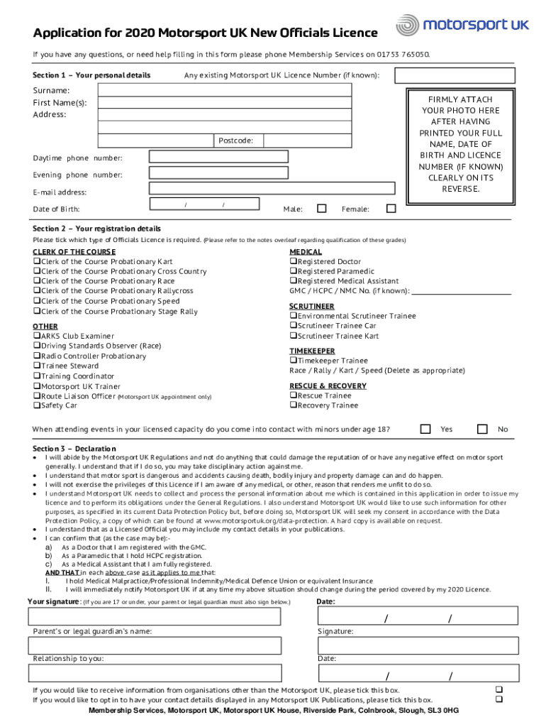 Application for 2020 Motorsport UK New Officials License If you have any questions, or need help filling in this form please phone Membership Services on 01753 765050. Section 1 Your personal details