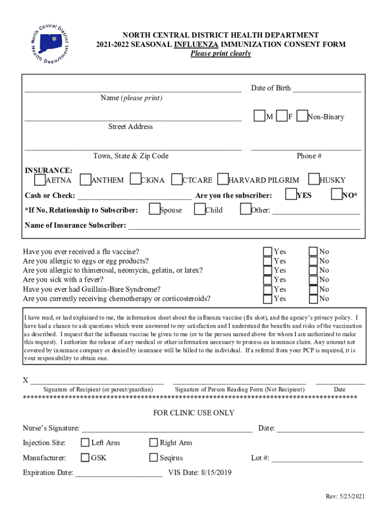 NORTH CENTRAL DISTRICT HEALTH DEPARTMENT 20212022 SEASONAL INFLUENZA IMMUNIZATION CONSENT FORM Please print clearly Name (please print) Street Address Town, State & Zip Code INSURANCE: AETNAANTHEMCIGNACTCAREDate