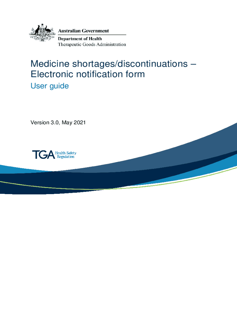 Medicine shortages/discontinuations Electronic notification form User guideVersion 3.0, May 2021Therapeutic Goods AdministrationCopyright Commonwealth of Australia 2021 This work is copyright. You