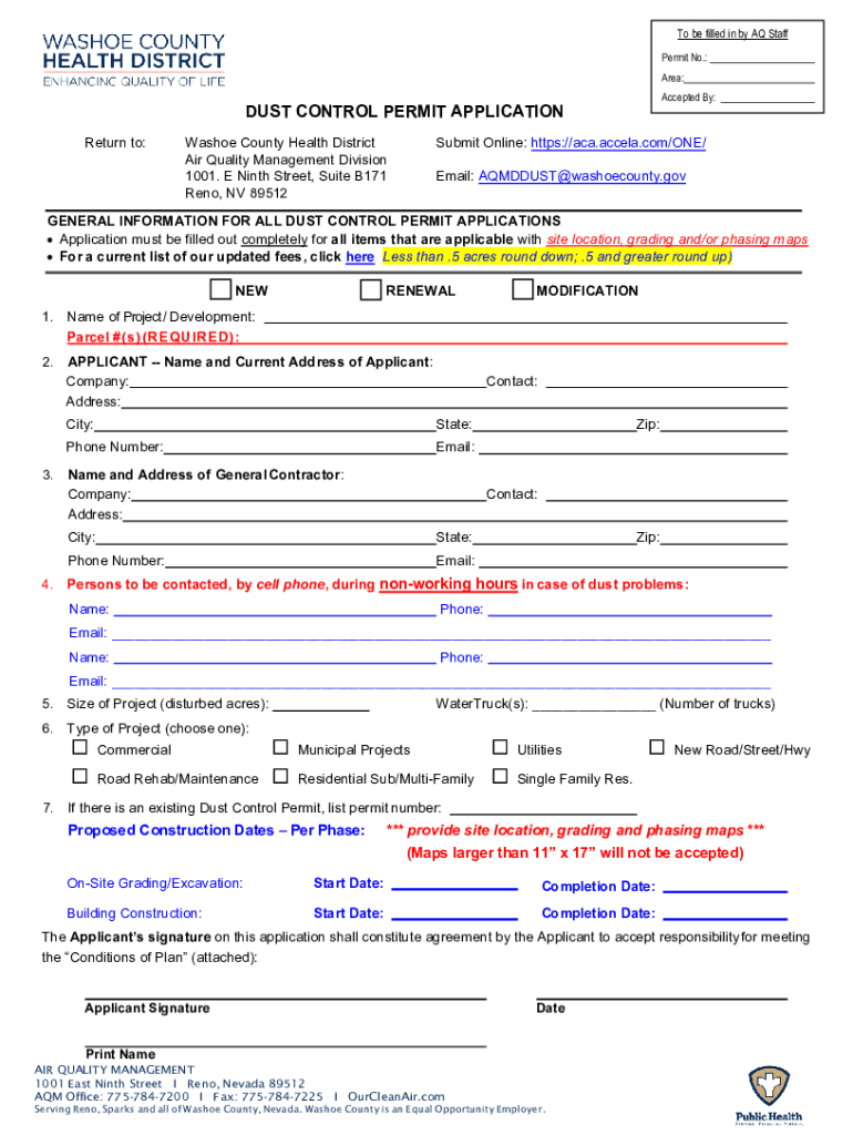 To be filled in by A Staff Permit No.: Area: Accepted By:DUST CONTROL PERMIT APPLICATION Return to:Washoe County Health District Air Quality Management Division 1001. E Ninth Street, Suite B171 Reno,