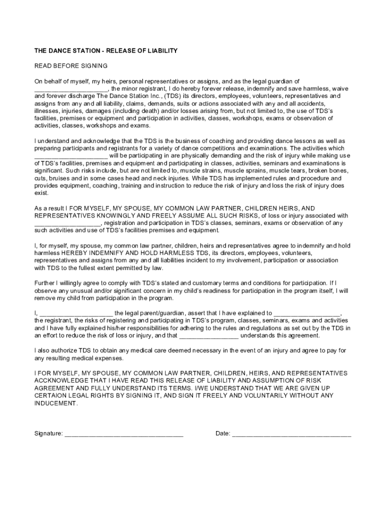 THE DANCE STATION RELEASE OF LIABILITY READ BEFORE SIGNING On behalf of myself, my heirs, personal representatives or assigns, and as the legal guardian of, the minor registrant, I do hereby forever