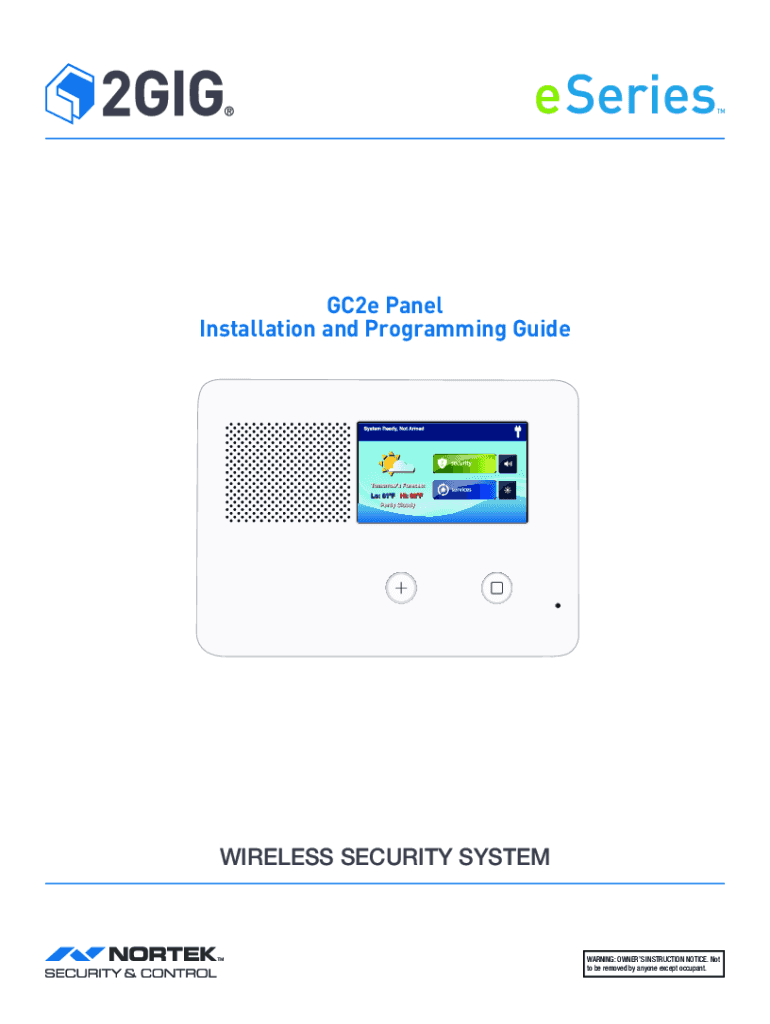 GC2e Panel Installation and Programming GuideWIRELESS SECURITY SYSTEMWARNING: OWNERS INSTRUCTION NOTICE. Not to be removed by anyone except occupant.GC2e Wireless Security System Installation and