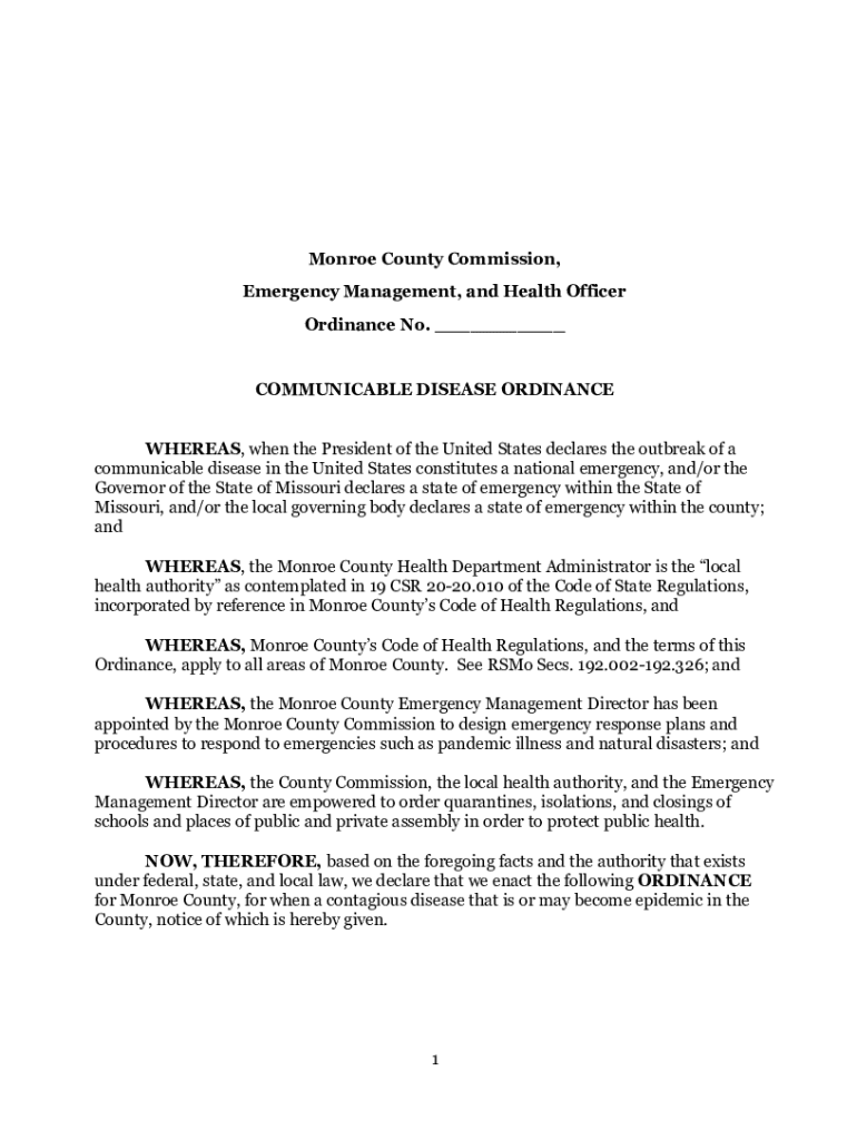 Monroe County Commission, Emergency Management, and Health Officer Ordinance No. COMMUNICABLE DISEASE ORDINANCE WHEREAS, when the President of the United States declares the outbreak of a communicable