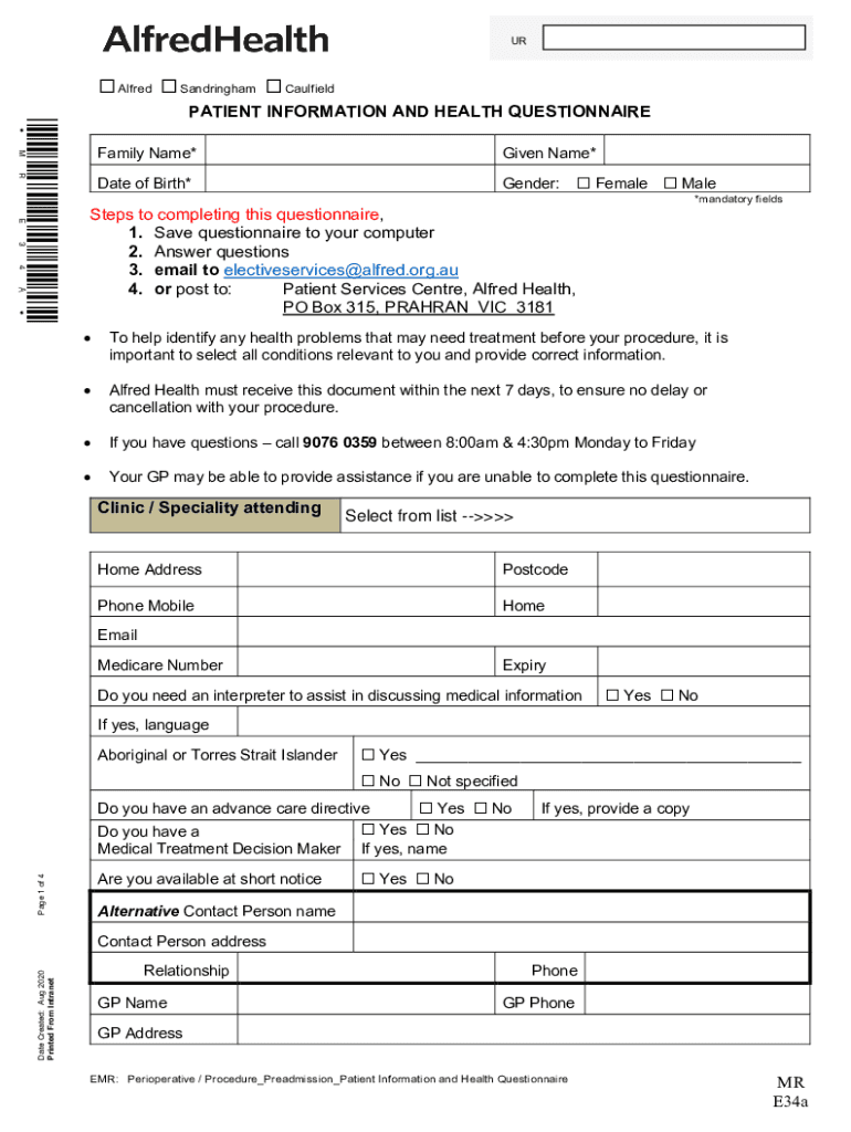 URAlfredSandringhamCaulfield×MR E34A×PATIENT INFORMATION AND HEALTH QUESTIONNAIRE Family Name×Given Name×Date of Birth×Gender: Female Male *mandatory fieldsSteps to completing this questionnaire,