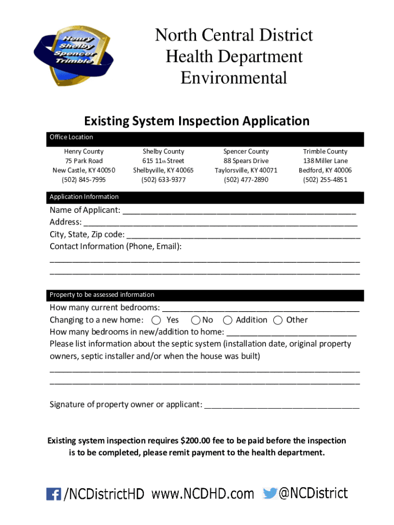 North Central District Health Department Environmental Existing System Inspection Application Office Location Henry County 75 Park Road New Castle, KY 40050 (502) 8457995Shelby County 615 11th Street