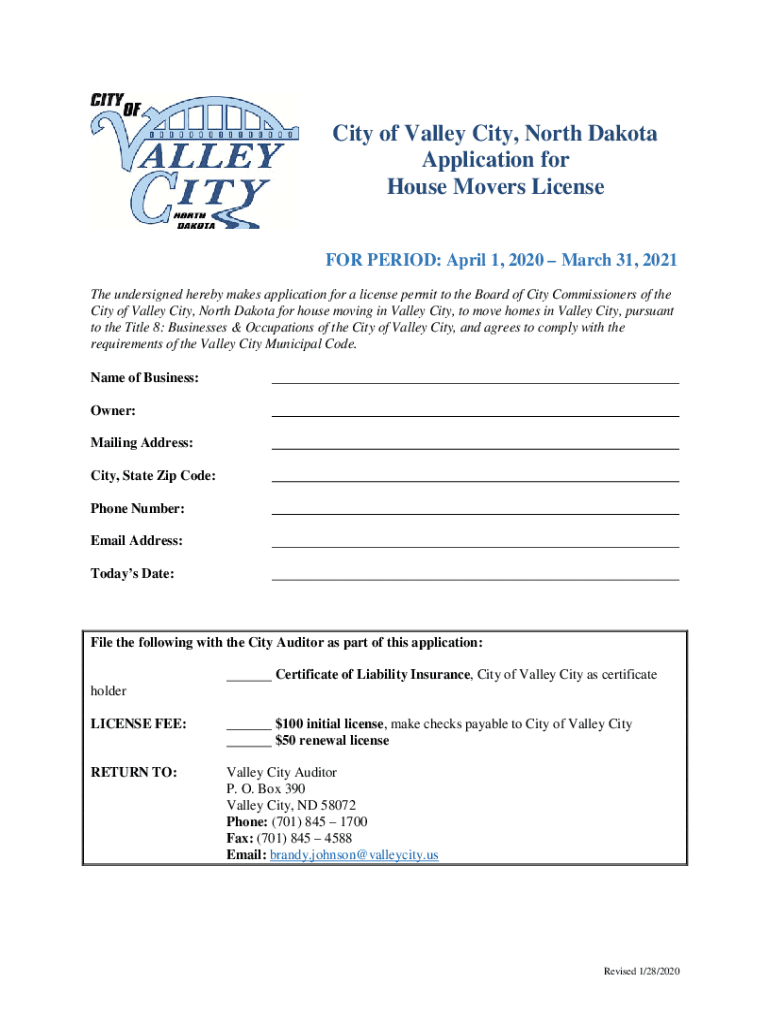 Get the free Application for House Movers License - Valley City