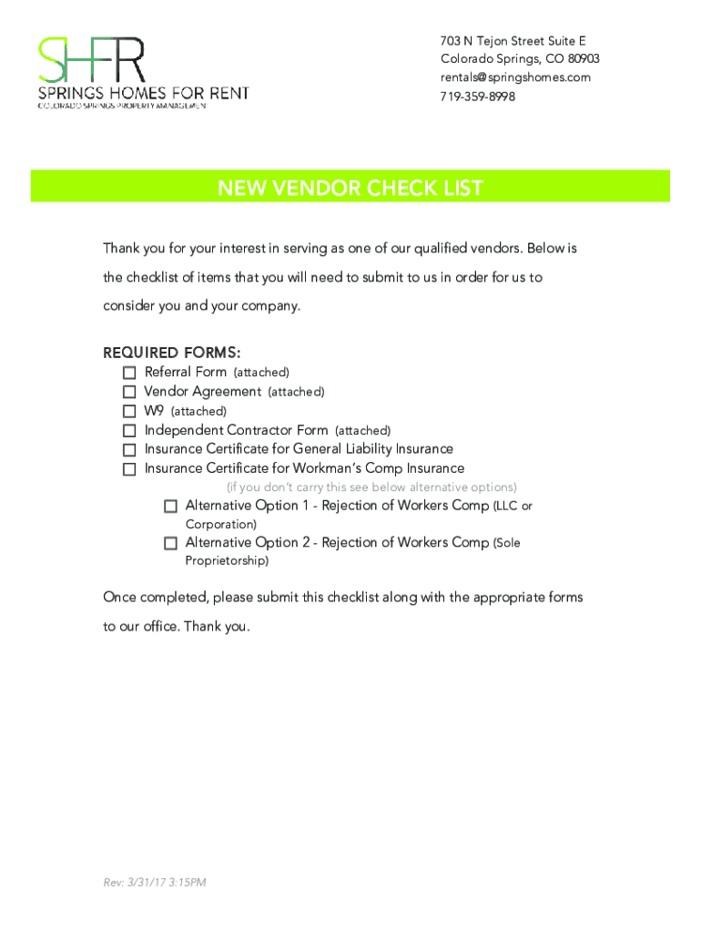 703 N Tenon Street Suite E Colorado Springs, CO 80903 rentals@springshomes.com 7193598998NEW VENDOR CHECK LIST Thank you for your interest in serving as one of our qualified vendors. Below is the