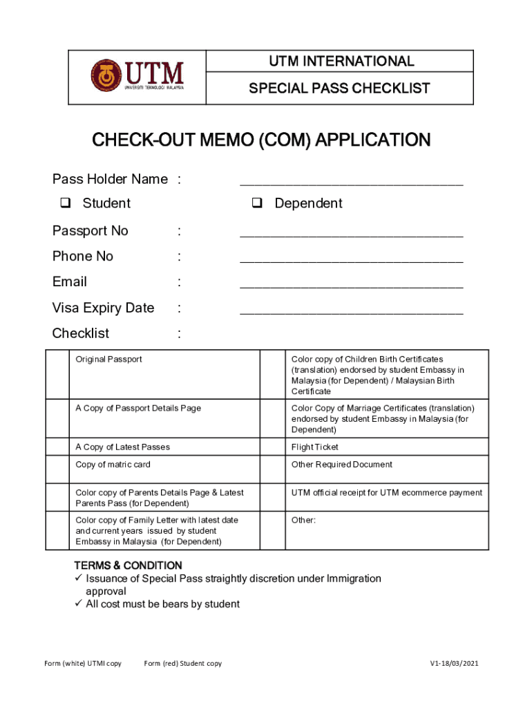 UTM INTERNATIONAL SPECIAL PASS CHECKLISTCHECKOUT MEMO (COM) APPLICATION Pass Holder Name : Student DependentPassport No: Phone No: Email: Visa Expiry Date: Checklist:Original PassportColor copy of