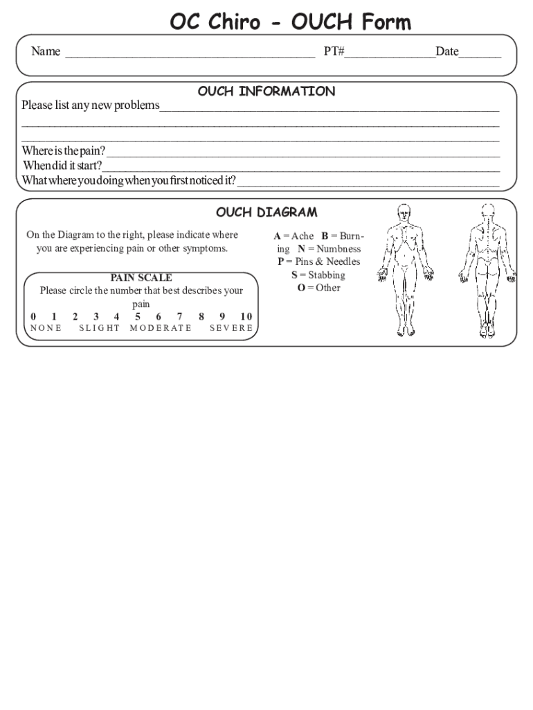 OC Cairo OUCH Form Name PT# Date OUCH INFORMATION Please list any new problems Where is the pain? When did it start? What were you doing when you first noticed it? OUCH, DIAGRAM On the Diagram to