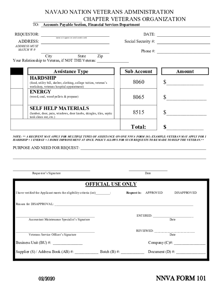 NAVAJO NATION VETERANS ADMINISTRATION ___ CHAPTER VETERANS ORGANIZATION TO: Accounts Payable Section, Financial Services Department REQUESTOR:ADDRESS:(name as it appears on social security card)ADDRESS