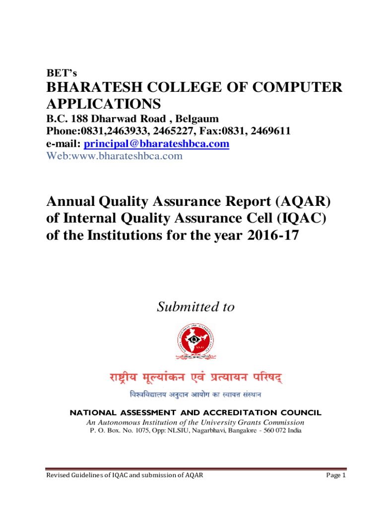 BETsBHARATESH COLLEGE OF COMPUTER APPLICATIONS B.C. 188 Dharma Road, Belgaum Phone:0831,2463933, 2465227, Fax:0831, 2469611 email: principal@bharateshbca.com Web:www.bharateshbca.comAnnual Quality