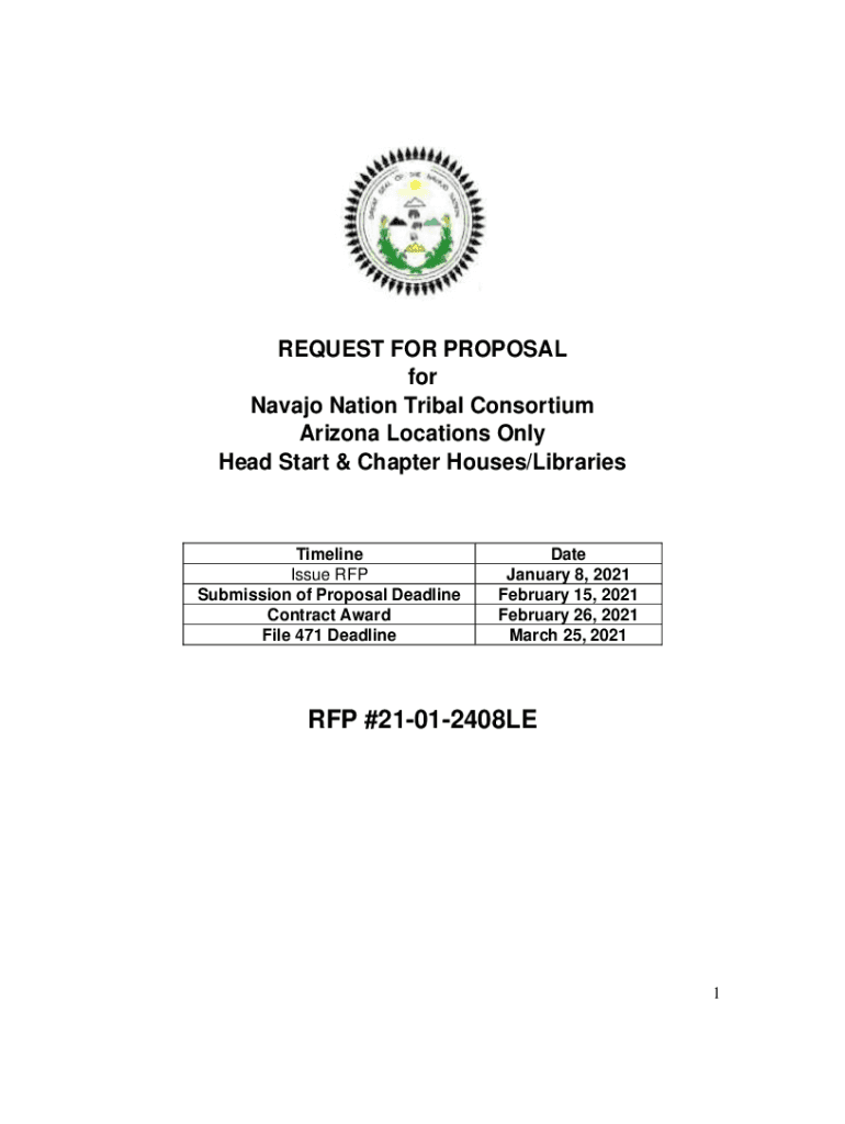 REQUEST FOR PROPOSAL for Navajo Nation Tribal Consortium Arizona Locations Only Head Start & Chapter Houses/LibrariesTimeline Issue RFP Submission of Proposal Deadline Contract Award File 471 Delineate