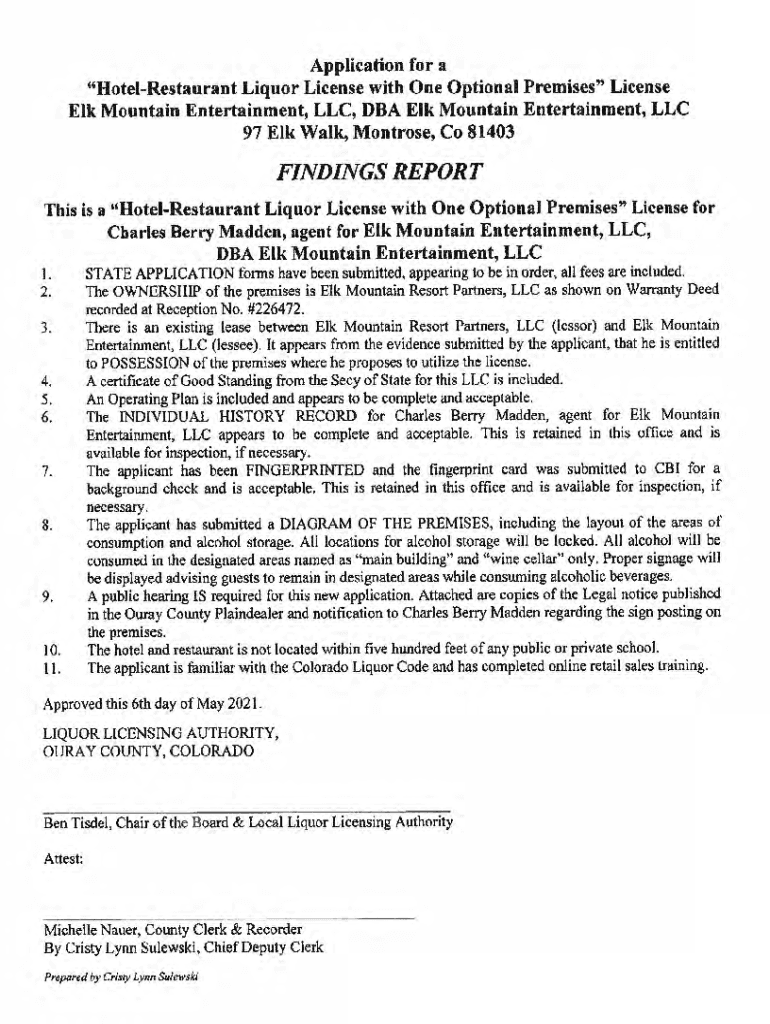 Application for a HotelRestaurant Liquor License with One Optional Premises License Elk Mountain Entertainment, LLC, DBA Elk Mountain Entertainment, LLC 97 Elk Walk, Montrose, Co 81403FINDINGS REPORT