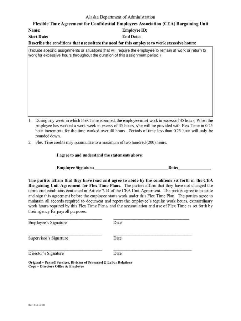 Alaska Department of Administration Flexible Time Agreement for Confidential Employees Association (CEA) Bargaining Unit Name: Employee ID: Start Date: End Date: Describe the conditions that necessitate