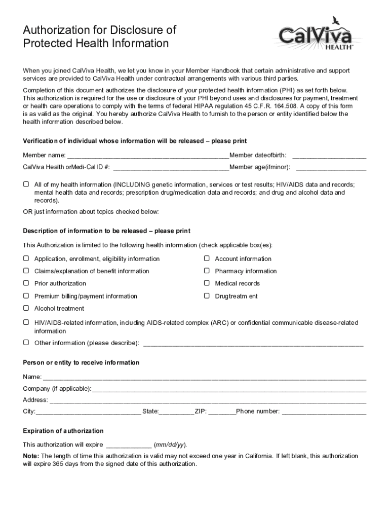 Authorization for Disclosure of Protected Health Information When you joined Calvin Health, we let you know in your Member Handbook that certain administrative and support services are provided to