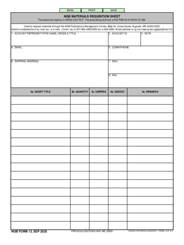 EMAILPRINTSAVENGB MATERIALS REQUISITION SHEET The proponent agency is ARNGCSOFCP. The prescribing directive is NG PAM 2531/ANTI 33360. Used to request materials through the GB Publications Management