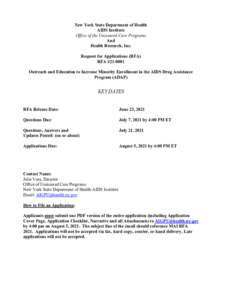 New York State Department of Health AIDS Institute Office of the Uninsured Care Programs And Health Research, Inc. Request for Applications (RFA) RFA #210001 Outreach and Education to Increase Minority