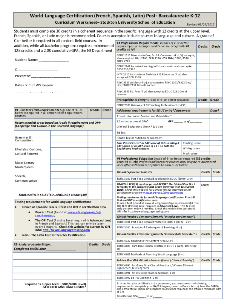 World Language Certification (French, Spanish, Latin) Post Baccalaureate K12 Curriculum Worksheet Stockton University School of EducationRevised 03/24/2017Students must complete 30 credits in a coherent