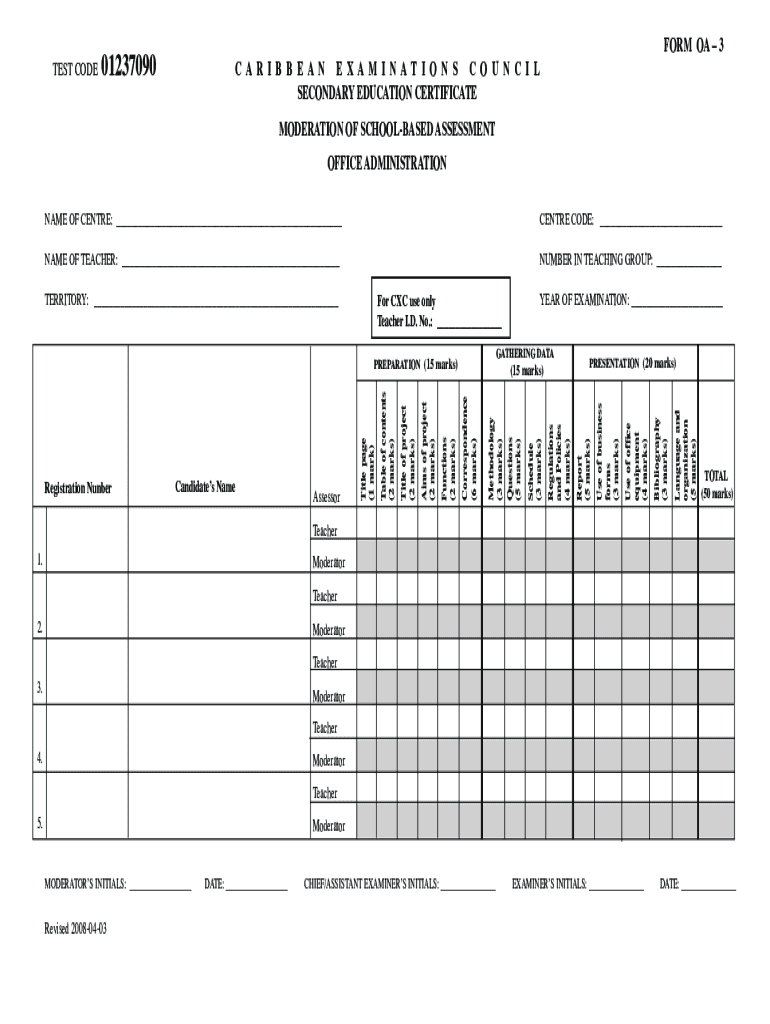 TEST CODE01237090FORM OA 3C A R I B B E A N E A M I N A T I O N S C O U N C I L SECONDARY EDUCATION CERTIFICATE MODERATION OF SCHOOLED ASSESSMENT OFFICE ADMINISTRATIONNAME OF Center: Center CODE: