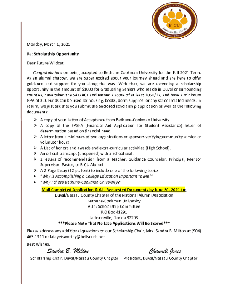 Monday, March 1, 2021, Re: Scholarship Opportunity Dear Future Wildcat, Congratulations on being accepted to BethuneCookman University for the Fall 2021 Term. As an alumni chapter, we are super excited