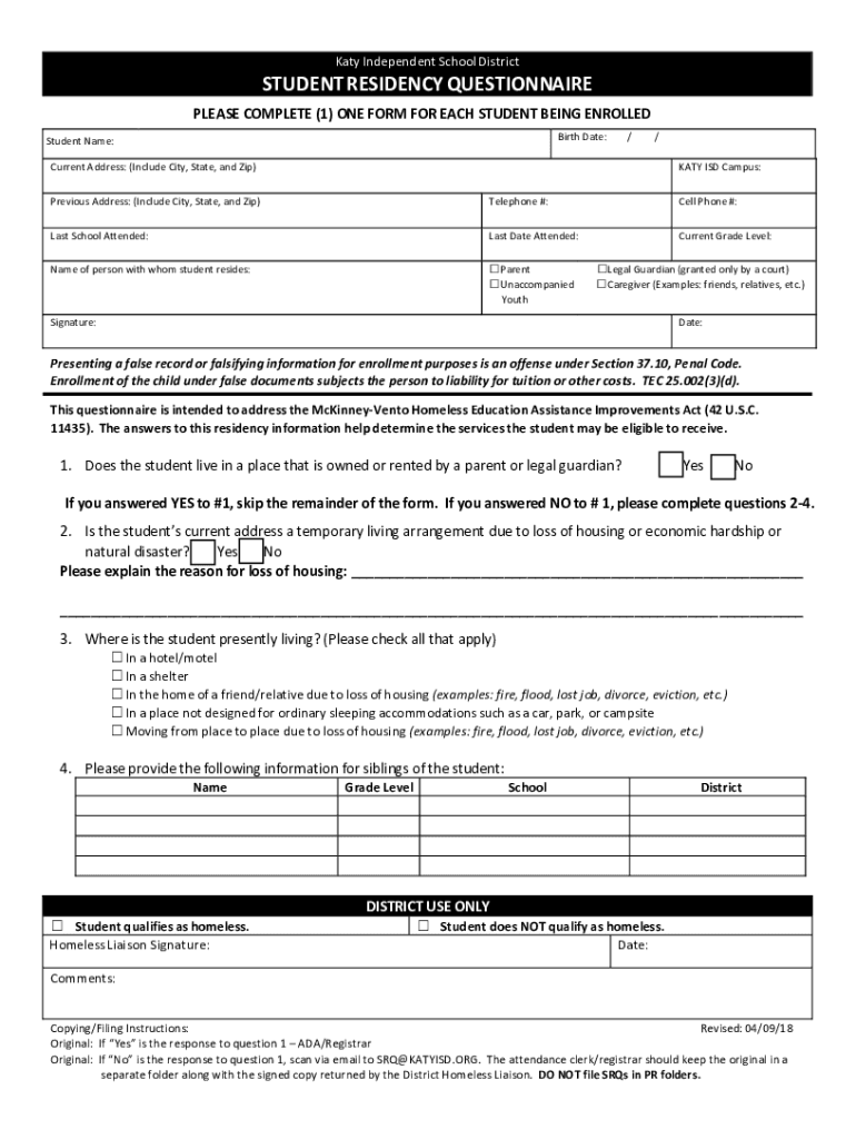 Katy Independent School DistrictSTUDENT RESIDENCY QUESTIONNAIRE PLEASE COMPLETE (1) ONE FORM FOR EACH STUDENT BEING ENROLLED Birth Date:Student Name://Current Address: (Include City, State, and Zip)KATY