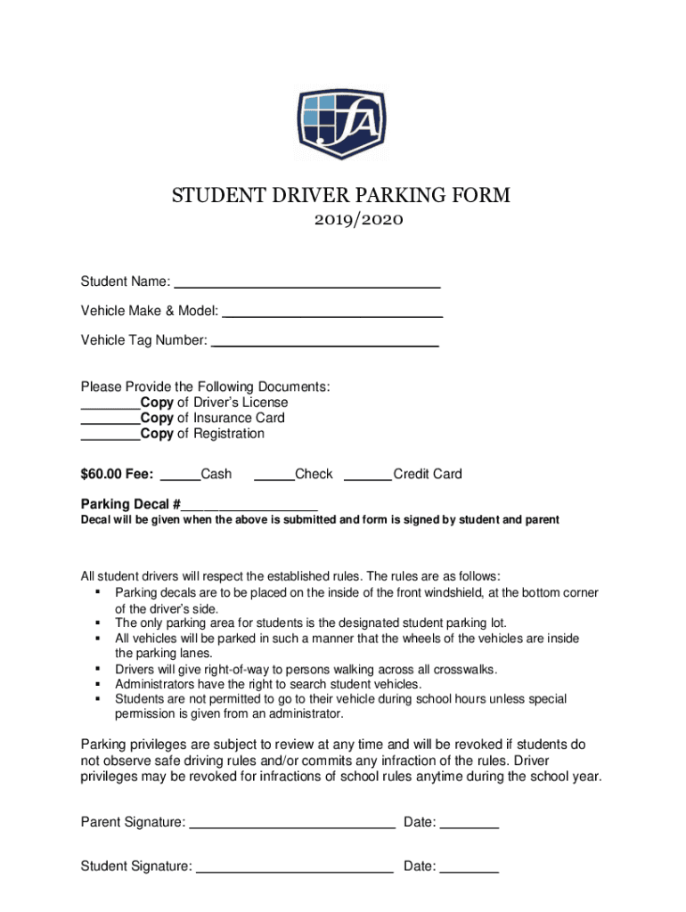 STUDENT DRIVER PARKING FORM 2019/2020Student Name: Vehicle Make & Model: Vehicle Tag Number: Please Provide the Following Documents: Copy of Driver's License Copy of Insurance Card Copy of Registration