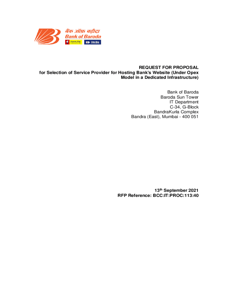REQUEST FOR PROPOSAL for Selection of Service Provider for Hosting Bank's Website (Under Opex Model in a Dedicated Infrastructure)Bank of Baroda Sun Tower IT Department C34, Block BandraKurla Complex