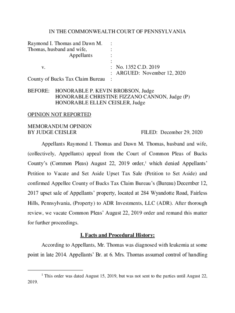IN THE COMMONWEALTH COURT OF PENNSYLVANIA Raymond I. Thomas and Dawn M. Thomas, husband and wife, Appellants v. County of Bucks Tax Claim Bureau BEFORE:: : : : : No. 1352 C.D. 2019 : ARGUED: November