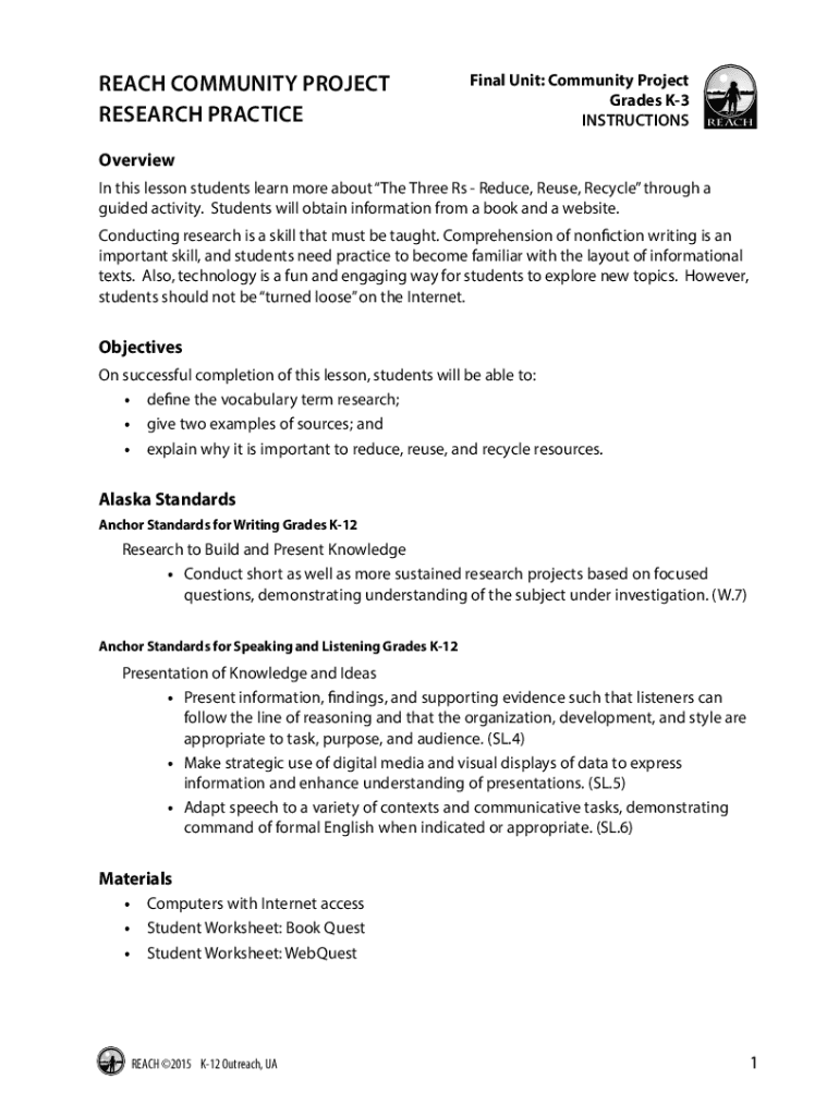 Reach community project research practiceFinal Unit: Community Project Grades K3 INSTRUCTIONSREACHOverview In this lesson students learn more about The Three Rs Reduce, Reuse, Recycle through a guided